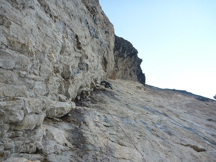 Ci vorranno altre quattro giornate di “lavoro” divise in due tentativi per completare tutto il diedro ed il traverso sotto i tetti, che si rivelerà meno difficile di quanto immaginavamo. L’artificiale è abbastanza spinto, fatto di chiodi che non “cantano”, cliff e friends in fessure decisamente marce. Nonostante ciò siamo sempre riusciti a fare delle ottime soste; entrambi non siamo degli esperti artificialisti quindi le gradazioni da noi indicate non devono essere prese troppo alla lettera.