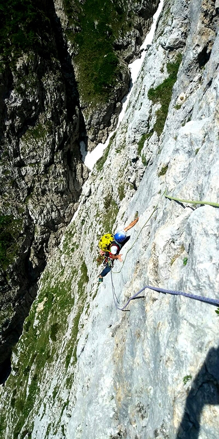 Partiamo per questo viaggio, soli fra le pareti, pochi chiodi con noi, quelli per le soste e qualcuno in più per i passaggi. Il ritmo della cordata si fa fluido, la serenità che ci avvolge è disarmante a volte, così i tiri si susseguono intervallati dal tintinnare dei chiodi che entrano a forza e sudore nelle fessure.