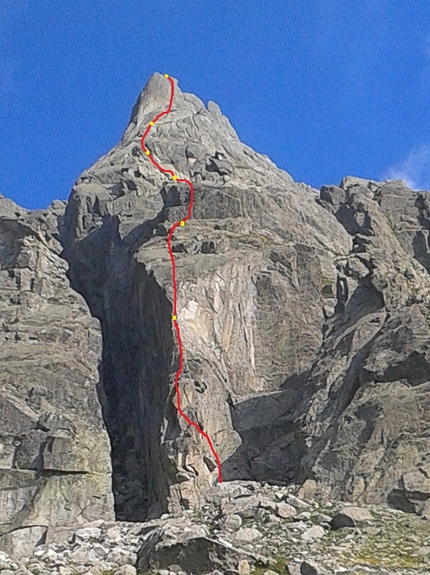 La partenza è veramente evidente, è il tiro chiave e l'abbiamo chiamata la pinna dello squalo, chi vorrà ripeterla capirà poi il motivo. Le soste sono miste fix e chiodi, alcuni fix sui passaggi chiave.
