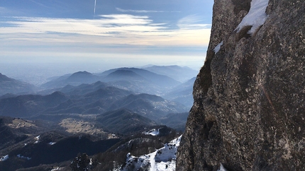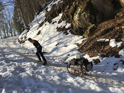 Arriva la neve e per l’apertura dei restanti tiri dobbiamo aspettare. È il 15 febbraio ma la strada per Campogrosso è ancora chiusa, niente paura... carichiamo i ferri sulla slitta tanto ci pensa Nicola a trainare! La neve ci regala l’ambiente giusto per completare la via oltre che migliorare la qualità della progressione. Dalla cengia che collega la terza lunghezza con il quinto ed ultimo tiro arrivo a sistemare la sosta in mezzo ad un bel pò di neve, gran bell’ambiente per essere nelle nostre Piccole Dolomiti.