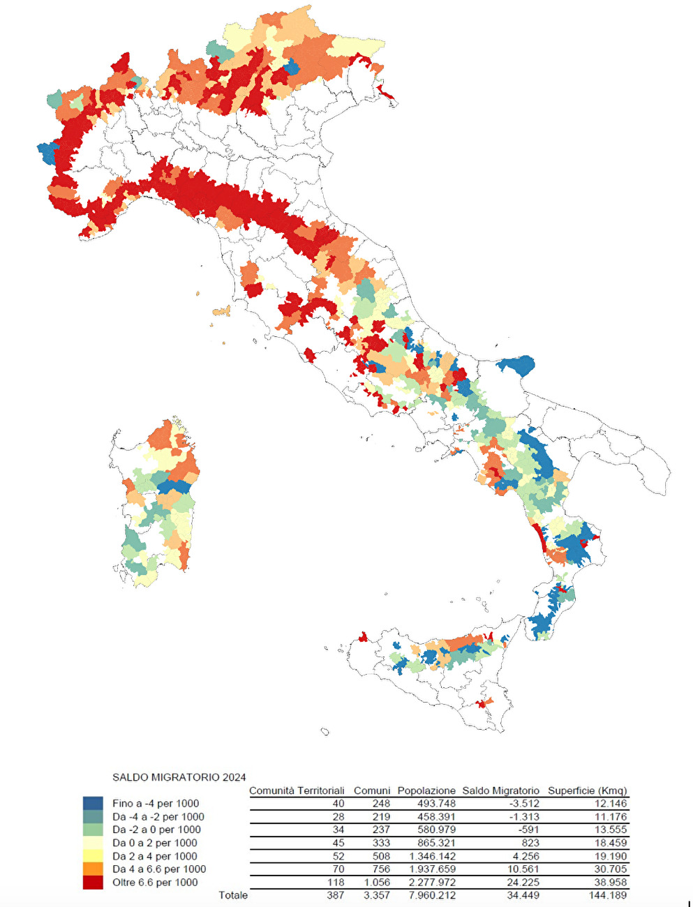 Degno di nota è anche il fatto che il valore medio del saldo migratorio (degli italiani) in ciascuna Comunità territoriale passa dal valore di 1.383 persone all'anno nel periodo 2019 2023 alle 2.780 al 2024 (+63,9%).