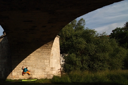 Sono passati oltre 120 anni da quel momento, ma il fascino di "rubare" qualche salita inusuale è forte come non mai. Le difficoltà così come le opportunità sono aumentate a dismisura, e dopo la fessura Ticket crack in Belgio e il pazzesco sottopassaggio a Montreal in Canada, adesso presentiamo questo spigolo chiamato Exhumace vicino a Brno nella Repubblica Ceca. Liberato nel 2002 da Ivo David con una difficoltà stimata attorno all’8B, richiede una tecnica del tutto particolare. L’altro giorno Adam Ondra l’ha ripetuto, definendolo uno dei boulder più belli che lui abbia mai salito, e giurando che con le scarpe da avvicinamento è più facile che con le scarpette d’arrampicata.