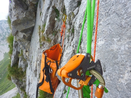 Daniele da tempo mi aveva proposto di ripetere la Yook Yook (stupenda via aperta da Ugo Pegurri con grande intuito e azzardo nel lontano '87, 170m 6c max 6b+ obbl ) e nel contempo richiodarla, le soste e gli spit lungo il percorso erano precari. Così, durante l'avvicinamento, mi racconta che a destra e alla sinistra della Yook aveva intravisto una nuova possibile linea di salita e che gli sarebbe piaciuto provare l'esperienza di aprire dal basso.