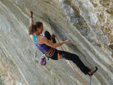 In realta Era Vella non era all'ordine del giorno, ma quando ho visto questo muro di 50 metri ho subito voluto provarla. Durante il mio primo tentativo mi sono resa conto che mancavano quei movimenti difficilissimi, tipici di un 9a. Sono riuscita a fare tutte le sequenze, tra cui anche la sezione chiave, abbastanza rapidamente, ma presto mi sono resa conto che su una via con oltre 100 movimenti, piuttosto strapiombante, le difficoltà sono ben altre. Mi ci sono voluti tre tentativi per trovare tutte le prese giuste per memorizzare la sequenza migliore in questo mare di buchi. Sulle altre vie difficili il primo ostacolo è sempre stato essere in grado di fare i singoli, ma su 'Era Vella' sapevo sarebbe stato necessario ottimizzare i movimenti al massimo per non perdere tempo e forze. Ho trovato particolarmente difficile individuare una sequenza più sicura per il passaggio chiave, ma poi l'ho risolto con un difficile incrocio perfetto per me.