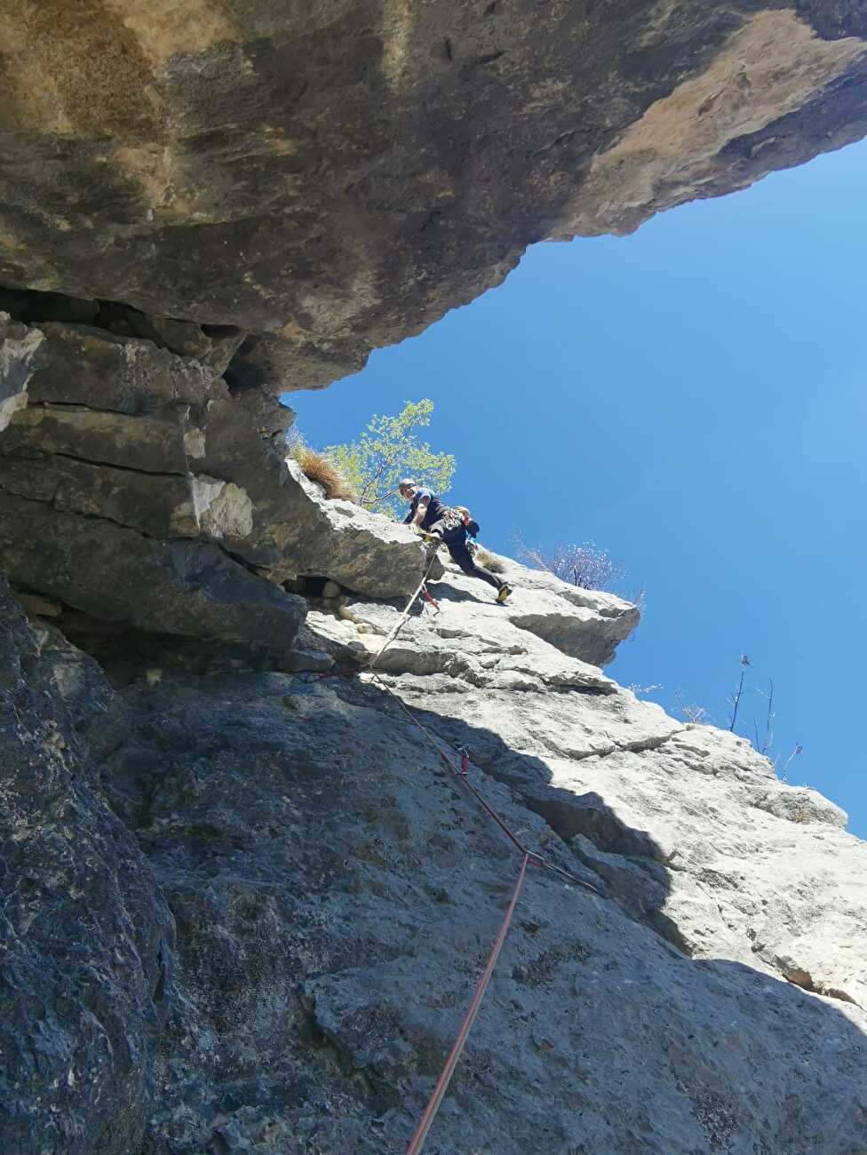 Intanto salivamo tiro dopo tiro, in alternata, come se facessimo zapping tra due serie TV che speri migliorino ma restano sempre sullo stesso piano narrativo: lento, ma tutto sommato coinvolgente. La roccia però migliorava davvero: diventava chiara, compatta, quasi incoraggiante. Le cenge rompevano l’arrampicata "ritmica" del buon vecchio Grill, ma noi ci dicevamo che una via senza interruzioni è troppo mainstream. Passando di qua e di là, navigando a vista, alla fine lo spigolo tornava sempre a farsi vedere, tipo mascotte ufficiale della salita.
