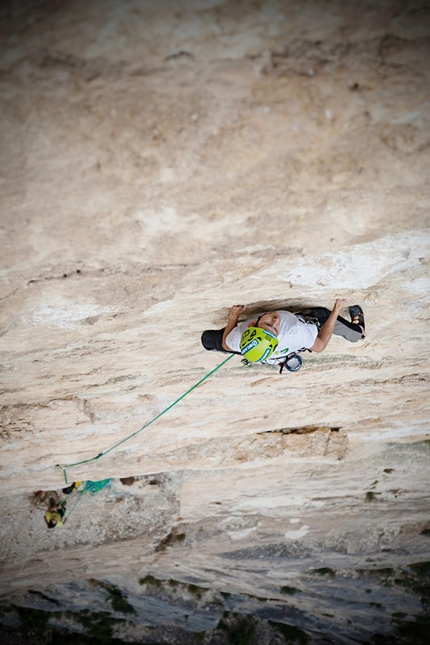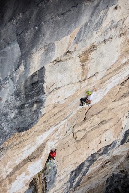 Sarà più facile dopo quel tetto? Mah… Riuscirò a passare di là senza “svolazzare” più di tanto..? Speriamo di sì... Sempre le solite domande che ti passano per la mente mentre ti riposi un attimo appeso all’ultima protezione posizionata. Eh se invece di avere questa malsana idea di andar su per sti gialli avessi scelto una bella placca grigia..? Non era forse meglio…? Ormai è tardi, ci sono dentro e devo finire. La prossima volta però la scelta sarà diversa, i gialli possono andare a quel paese. Tanto poi la prossima volta sarà sempre uguale... E’ una malattia, si chiama Giallomania.