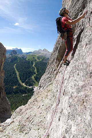Sul terzo tiro della nuva via aperta da Paolo Da Pozzo e Giuseppe Ghedina sul Co dei Bos (Falzarego, Dolomiti)