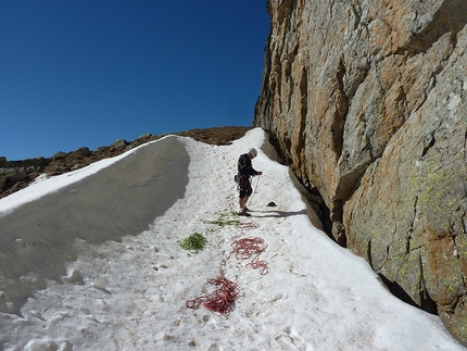 C’è ancora parecchia neve in giro, il Caldo non si è ancora impadronito del giorno, ma la voglia di ritornare in Val Maira mi spinge con qualche scusa a convincere Dario (Spreafico ndr) ad accompagnarmi. Partenza in piena notte, l’idea è chiara nella mia testa, voglio salire lungo Sete d’oriente, la linea aperta da Maurizio Oviglia e Compagni nel lontano Inverno del 1984. Ho osservato “Sete” dal basso, l’ho guardata mentre arrampicavo al suo fianco, bella, bellissima linea lungo una logica sequenza di lame e fessure, diritta verso il cielo, come piacciono a me!