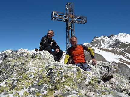 Sulla cima mi soffermo a guardare l’orizzonte, il mio sguardo viene rapito da montagne che non conosco, la neve evidenzia spigoli, diedri e canali, sono appagato, il libro di vetta accetta i nostri due nomi, la discesa è sicura e rapida …