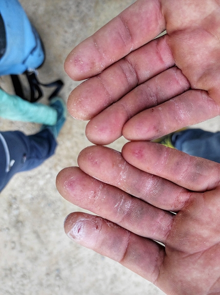 Ad ogni sosta il mio sorriso cresceva. Pieno di energia ho raggiunto l'ultimo tiro difficile, un 8a davvero boulderoso, solo poi per arenarmi su una sezione di 2 metri che mi sembrava del tutto impossibile. Tutte le speranze di chiudere la via in giornata sono improvvisamente svanite e ho iniziato a sentirmi frustrato. Ho tastato ovunque, toccando appigli inesistenti e non ho trovato modo per salire! Che peccato!