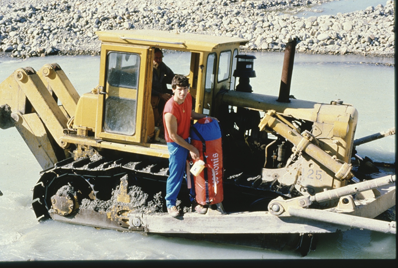 Mario Manica mentre attraversa il Rio Fitz Roy a El Chalten, Cerro Piergiorgio in Patagonia, 1985