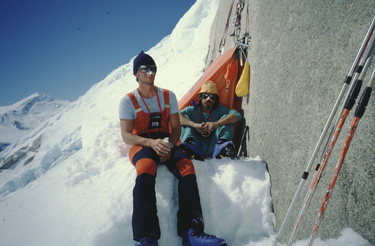 Mario e Renzo sotto la parete del Cerro Piergiorgio in Patagonia, 1985