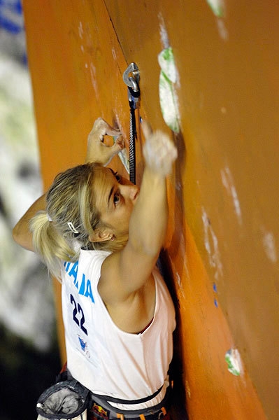 Anche qui gara “tranquilla”, su una via che però ha impegnato non poco le atlete, soprattutto per terminare entro il tempo massimo (7 minuti). Vittime illustri del cronometro, anche se nulla è stato compromesso per il risultato finale dei campionati, sono state le slovene Natalja Gros e Maja Vidmar entrambe fermate allo scadere quando ormai erano al top. Mentre ha “solo” toccato l’ultima presa Sandrine Levet (Fra). Un top invece che è stato (naturalmente) raggiunto dalla campionessa del mondo uscente Angela Eiter (Aut) e dalla “big ritornata” Muriel Sarkany (Bel), ma anche dalle impressionanti Emily Harrington (Usa), Irati Anda (Esp) e Yuka Kobayashi (Jpn). E poi dalla regolarissima Alexandra Eyer (Sui), da Caroline Ciavaldini (Fra), dalla 19enne Ja-In Kim (Kor) e dalla 17enne Charlotte Durif (Fra). Per Jenny Lavarda, l’unica italiana in gara (anche lei in corsa per la combinata) è stata una prova interlocutoria. Jenny ha un po’ esitato nella parte alta cadendo sotto l’ultima sezione, ma ha dimostrato di avere la forza per affrontare la lunga maratona che ha ancora davanti.
