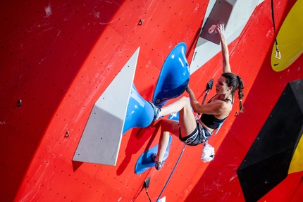 La vittoria di Kim davanti alla piazza gremita non era scontata. Nella Semifinale si era qualificata quarta dietro a Chaehyun Seo, Jessica Pilz e Nonoha Kume, e appena davanti a Miho Nonaka, Hélène Janicot, Mia Krampl e Vita Lukan. Mentre il sole tramontava dietro la sagoma del Monte Bianco, Lukan ha dato il via alle finali ma è caduta troppo presto sul primo lancio. La compagna di squadra Krampl è salita 4 prese più in alto, ma poi è scivolata cercando di stabilirsi sull'enorme volume chiudendo in sesta posizione. Mentre Hélène Janicot ha fatto impazzire la folla con la sua potente arrampicata prima di cadere dalla presa 38+. Un punteggio che alla fine le ha assicurato la medaglia di bronzo. Con la forza che la contraddistingue Miho Nonaka ha chiuso senza problemi la parte bassa della via, poi però è caduta una presa più in basso rispetto alla francese. L'atleta successiva, Jain Kim, dopo aver salutata la folla, ha regalato una salita bellissima, regale, un esempio di controllo e compostezza. Quasi troppo, perché ha rischiato di superare il limite dei 6 minuti e quando è caduta - 12 secondi prima della fine e appena sotto il top - la sensazione era che, con più tempo a disposizione, avrebbe potuto benissimo raggiungere la presa finale. La giovane Nonoha Kume è salita fino alla stessa presa di Janicot prima di cadere e quindi si è aggiudicata l'argento grazie al risultato migliore in semifinale. Jessica Pilz ha lottato notevolmente cercando di stabilirsi sull'enorme volume e, quando alla fine ci è riuscita, è caduta proprio come Nonaka. A questo punto era rimasta solo un'atleta in gara, la 19enne compagna di squadra di Kim, Seo Chaehyun, che purtroppo ha commesso un banale errore che le è costato caro: all'inizio della via ha saltato un rinvio e ha moschettonato quello successivo. Si è resa conto immediatamente del problema, ha sganciato la corda dal moschettone poi ha rinviato nell'ordine giusto, ma i giudici non hanno avuto altra scelta che fermare la sua corsa ed assegnarle il deludente 8° posto. Anche se non era di certo la sua serata, si è potuta consolare pensando che la fresca notte di Chamonix apparteneva comunque al suo mito Jain Kim.