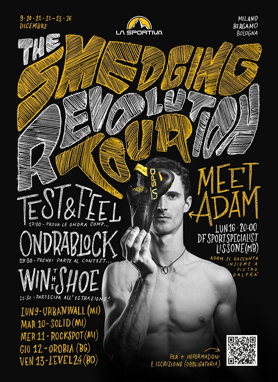Il tour vedrà il culmine lunedì 16 dicembre con una serata in compagnia di Adam Ondra presso DF Sport Specialist – Palazzo dello Sport a Lissone (MB). L’atleta ceco, in compagnia di Pietro Dal Prà e La Sportiva, è lieto di accogliere gli appassionati di arrampicata e la climbing community all’interno dello store per raccontare la nascita e lo sviluppo di Ondra Comp e rispondere a domande e curiosità da parte del pubblico, in un incontro che promette di essere di ispirazione per tutti gli appassionati di arrampicata boulder.
