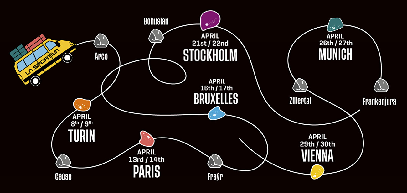 Il tour è guidato da alcuni tra gli atleti più rappresentativi di La Sportiva – Caroline Ciavaldini, James Pearson, Siebe Vanhee, Klaas Willems e Lara Neumeier – che ne diventano le voci narranti lungo le diverse tappe. Un percorso che mette in dialogo le due dimensioni fondamentali dell'arrampicata moderna – indoor e outdoor – avvicinando la scena delle palestre urbane alle radici outdoor che da sempre caratterizzano il DNA di La Sportiva.