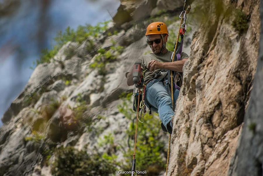 Bruno Fornari durante i lavori di chiodatura della Falesia del Babo, Val d'Adige