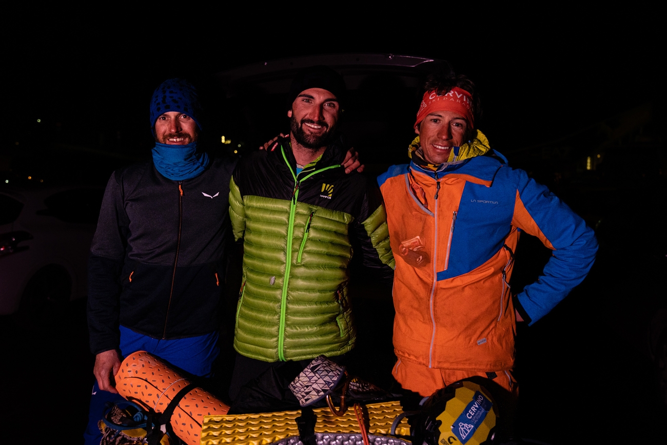 Emrik Favre, Stefano Stradelli, François Cazzanelli dopo l'apertura di 'Couloir Isaïe' alla Punta Brendel, Aiguille Noire du Peuterey (12-13/02/2023)