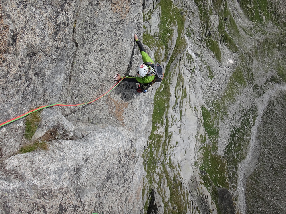 Matteo Rivadossi sugli ultimi metri di L6 di Freccia d’Argento sul Cornetto di Salarno in Val Salarno (Adamello)