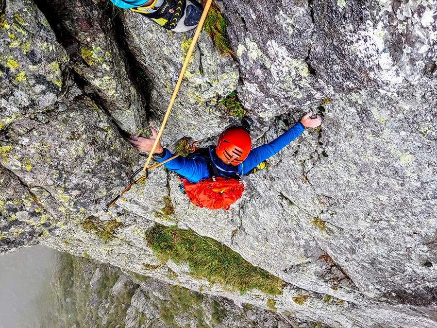 Alessandro Beretta assicurato da Cristian Candiotto durante la prima salita di Ghost Rider sul Dente di Mezzaluna in Valgerola (11/08/2019)