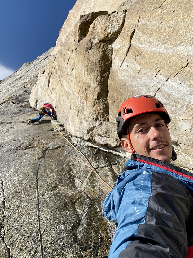 Federica Mingolla assicurata da Leo Gheza su Manitua alle Grandes Jorasses, massiccio del Monte Bianco