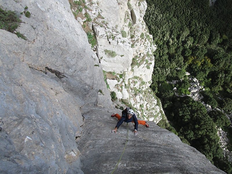 Massimo Flaccavento sul quinto tiro durante la libera della via Heroes (6b+, 186m, Giuseppe Barbagallo, Massimo Flaccavento, Giorgio Iurato) Pizzo Campana (Rocca Busambra)