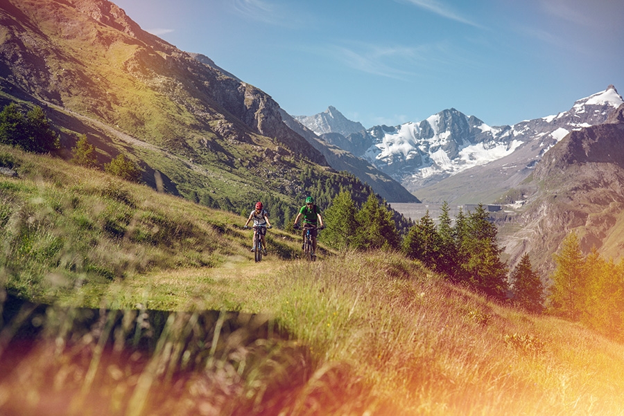 Svizzera a piedi sul sentiero dei Passi Alpini: estate in montagna, una famiglia in mountain bike a Saas Fee
