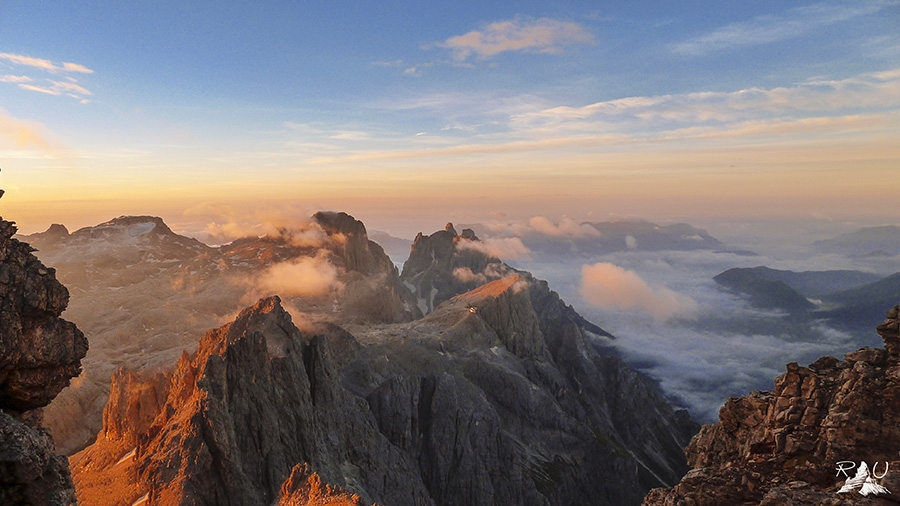 Le Dolomiti di Ruggero Alberti: foto scattata all'alba poco sotto la vetta del Cimon della Pala. Sullo sfondo l'altopiano delle Pale di San Martino illuminato dai primi raggi di sole e in ombra la valle del Primiero sotto le nuvole.