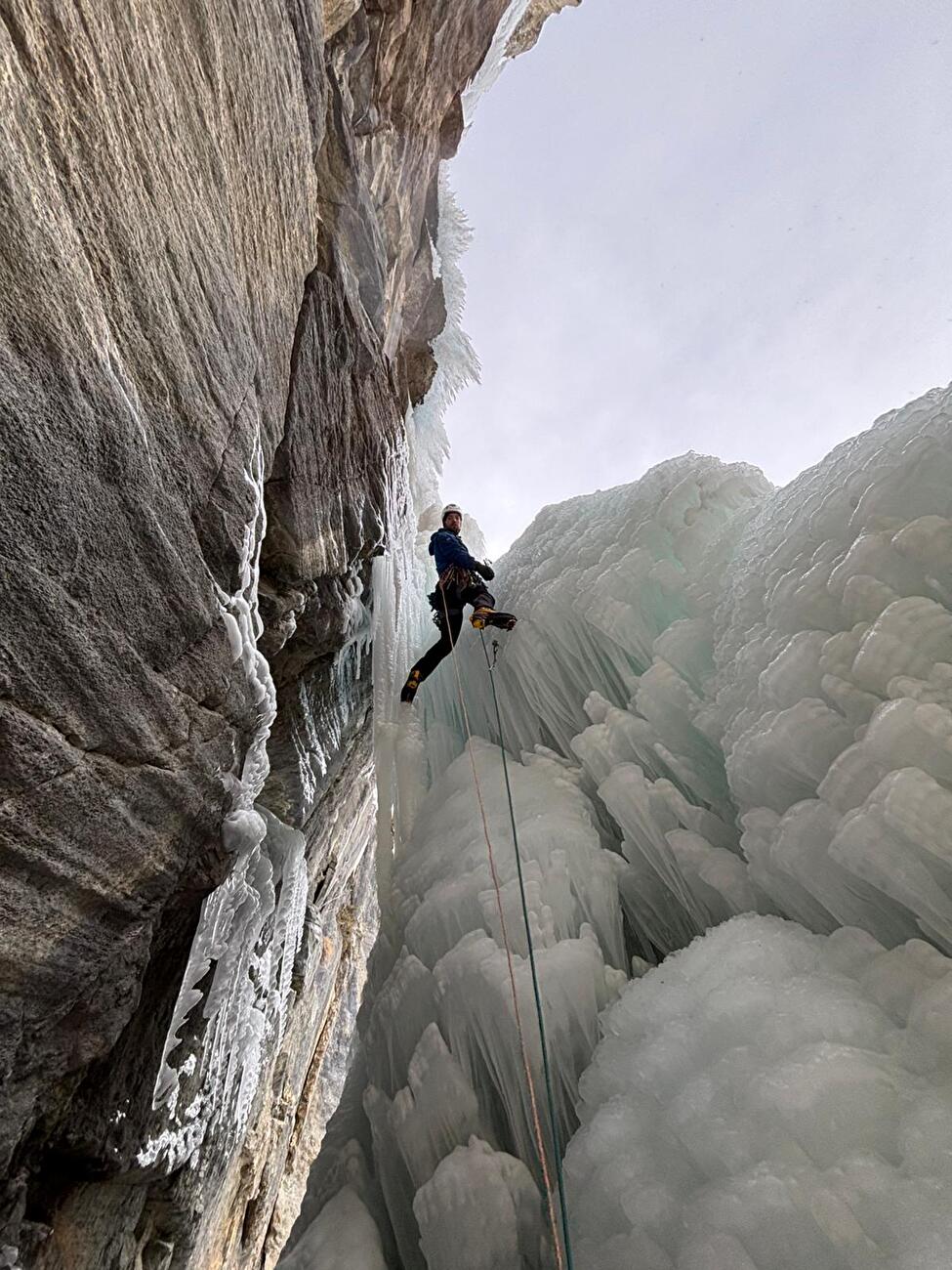Giovanni Ravizza sul primo tiro di 'Il fantasma di ghiaccio' in Valsavarenche, prima di aprire la variante dry 'Le Fantôme du Bricolage' (Niccolò Bruni, Giovanni Ravizza, 08/01/2026)
