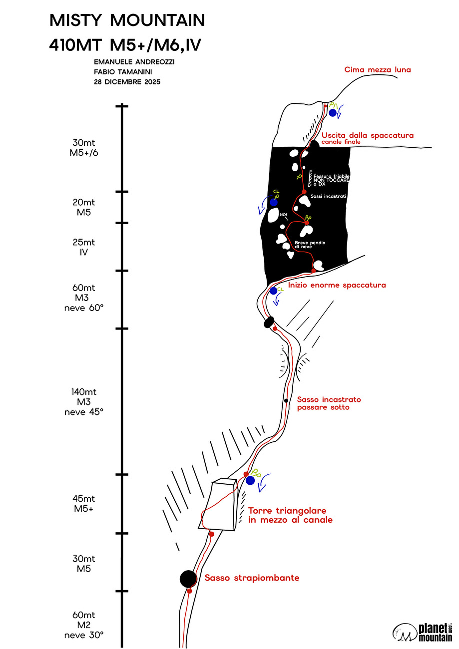 La relazione di 'Misty Mountain' alla parete nord della Mezza Luna in Vallaccia, Dolomiti (Emanuele Andreozzi, Fabio Tamanini 28/12/2025)