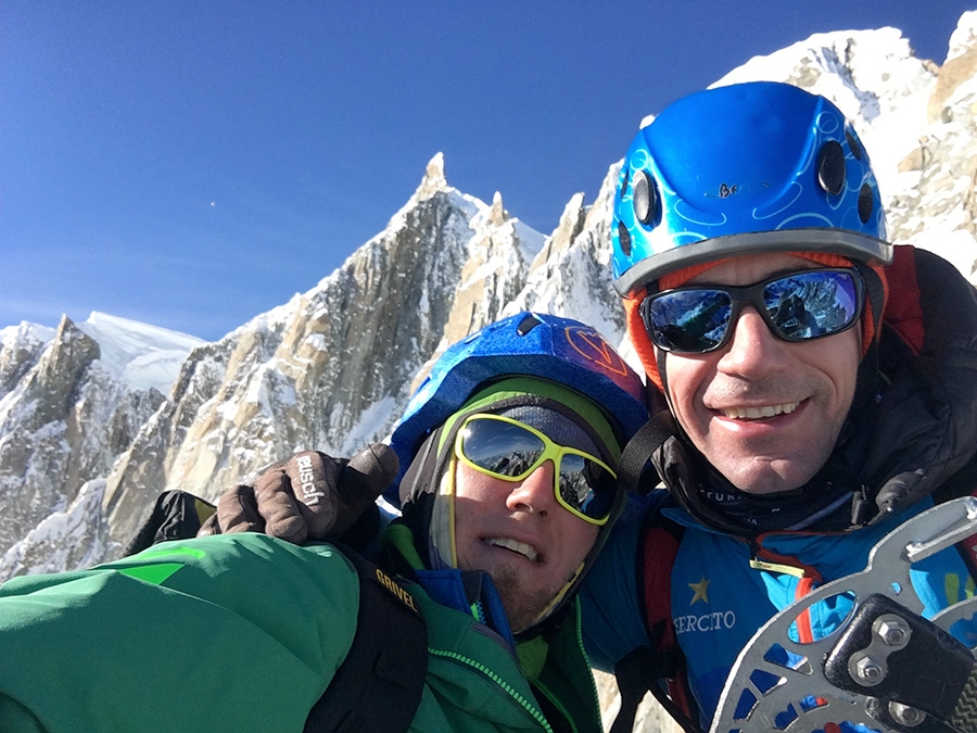 Denis Trento e Filip Babicz insieme in cima dopo l'apertura di Forza Gioele, Pointe de l'Androsace, Monte Bianco