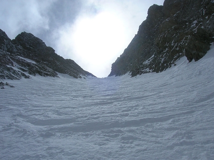 In questo video presentiamo una discesa in soggettiva quasi “integrale” del canalone nel senso che sono state tagliate solo le pause per contenerne la visione in tempi accettabili. Il giorno in cui è stato girato il video il canale è stato percorso da una decina di sciatori provenienti non solo dall’Italia, ma anche dall’estero, addirittura dal Lussemburgo. Come mostrano le immagini, alla partenza la neve è molto segnata, il che giustifica almeno in parte le esitazioni dello sciatore, in parte, invece, da attribuirsi a materiali non proprio adatti alla bisogna … Degli scarponi pensati per le gare di scialpinismo non sono esattamente i più indicati per una persona di 90 kg che voglia cimentarsi con pendenze che raggiungono i 50°. Così come non lo è avere una lamina rotta su uno dei due sci, anche se accuratamente posta all’esterno dello sci a valle come sapientemente consigliato da chi, Renato Onofri, gli sci li cura con passione da oltre trent’anni.