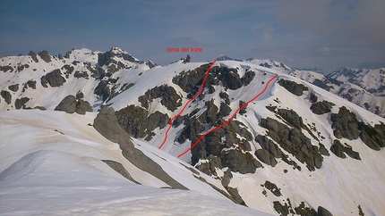 01/05/2018 la parete ovest del monte. Essendo stata effettuata la salita in primavera inoltrata il percorso è stato scelto in base all’innevamento presente e segnato in foto. È possibile che in condizioni diverse tutto il canale che scende dalla cresta sud verso ovest sia percorribile fino alla base della parete.