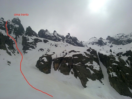 Canale Nord accesso: da ponte Tedon in val campelle si seguono le indicazioni per il rifugio 24/04/2011 claudio e renzo, raggiunto il rifugio si riprende a salire verso la val orsera fino a quota 2000 oltrepassando tutto il catino alto, da qui volgendo a sud si prende l’ampio canale che scende ad est di Cima Trento, percorso un centinaio di metri si abbandona il canale principale e si prende un canalino sulla sinistra che va proprio ad infilarsi tra Cima Trento e Cima Brunella. Il canale ha pendenze intorno ai 40 gradi, forse qualcosa di più in certi punti. Percorso tutto il canale si arriva sulla forcella tra le due cime. E’ possibile con difficoltà alpinistiche raggiungere entrambe le cime (meglio avere una corda e qualche protezione). Con prudenza calzati gli sci si scende tutto il canale facendo attenzione all’eventuale salto scoperto che con poca neve si trova alla fine del canale.