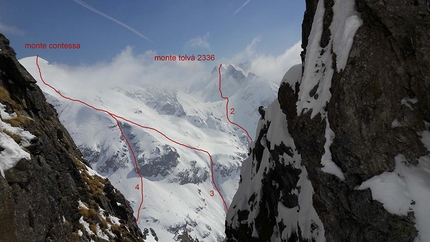 Accesso: dal tornante a quota 1850 del sentiero n. 338 per forcella regana, si attraversa il torrente e si punta direttamente al canale che parte poco sopra. Sbucati sui pendii che scendono direttamente dalla cresta che collega cima contessa alla contessat si prosegue in direzione est cercando il percorso più sicuro.