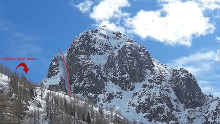 Canale del Pastor accesso: si abbandona il sentiero estivo n. 382 a quota 1850 e si punta verso ovest 25/03/2018 all’evidente canale diviso da un sperone nel suo imbocco. Si segue per intero tutto il canale che ha un pendenza di circa 40° per poi arrivare a 55° nel tratto finale dove diviene molto stretto. La discesa avviene per lo stesso itinerario facendo molta attenzione ai primi 80 metri dove son stati lasciati 3 chiodi per le calate.