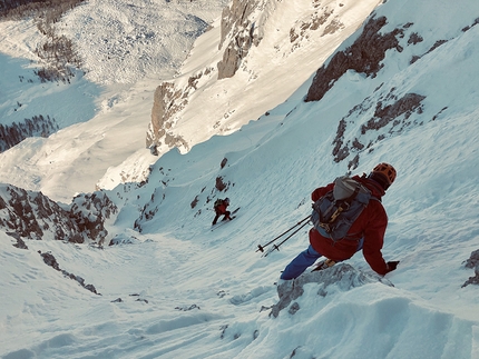 Sfruttando gli impianti ci siamo portati in quota fin su al Grostè, da lì sci ai piedi fino alla base della parete. 600 metri molto lineari, affrontati in salita con piccozze e ramponi. Sono circa tre i punti delicati in salita, delle varianti su terreno misto per lasciare integra la linea di discesa.