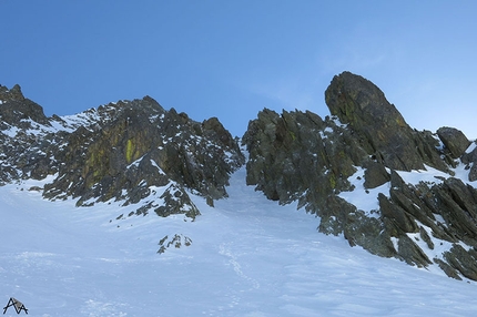 Canale bello, rettilineo e ben incassato tra le rocce questo Dufranc. Si sale volentieri: buona neve e ottimo ambiente, un paio di strettoie lasciano il dubbio se dovremo levarci gli sci in discesa.