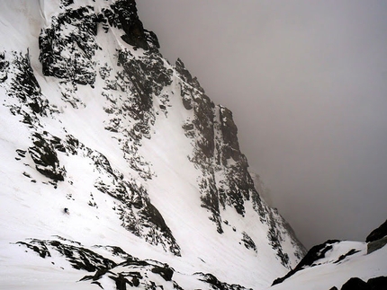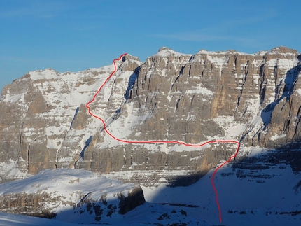 La parete Nord del Corno di Denno è un sogno di lunga data: il Corno di Denno è una montagna delle Dolomiti di Brenta meridionali, il Brenta più selvaggio lontano dai rifugi e dagli impianti. Anche se posta in una posizione che domina sulla val di Tovel e la Val di Non, raggiungerla in inverno non è semplice. Dalla via normale le ascese medie annue si possono contare sulle dita di una mano. Si tratta di una linea vista e tentata da altri ma qui compiuta per la prima volta. (Aprile 2018, Luca e Roberto Dallavalle e Andrea Concini)