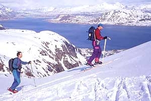 A est di Tromsø si stende una vasta area particolarmente remunerativa per la pratica dello scialpinismo, la penisola di Lyngen. La parte centrale della penisola è caratterizzata dalla presenza di ampi ghiacciai e da imponenti montagne le cui cime principali sono a nord il Jægervasstind 1668m e a sud il Jiehkeàrri 1883m. Tuttavia le cime più interessanti da un punto di vista scialpinistico sono quelle vicino al mare, più facilmente raggiungibili, con dislivelli che vanno dai 700 ai 1300m. Di seguito vengono riportate solo alcune delle tante possibilità della zona, ma vi renderete conto che, una volta sul posto, potrete scoprirne tante altre. Il periodo migliore per l’effettuazione delle gita va generalmente da aprile a maggio.