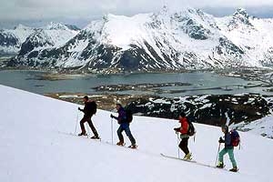 Molto frequentate d’estate, queste splendide isole acquistano durante il periodo invernale un fascino del tutto particolare grazie al fortissimo contrasto fra neve e mare. La morfologia dell’arcipelago è estremamente complessa: fiordi, laghi, strette insenature si alternano a ripide pareti rocciose che precipitano direttamente nel mare. Le cime non raggiungono quasi mai i 1000m, per cui anche se si parte generalmente dal livello del mare, i dislivelli da affrontare sono bassi. Di seguito riportiamo una descrizione sintetica di alcune delle possibilità sciistiche; si tratta di itinerari molto brevi e facili, ma non preoccupatevi troppo per questo, poichè le sensazioni che queste discese possono regalare sono veramente bellissime; nulla vieta comunque di effettuare più di una gita al giorno.