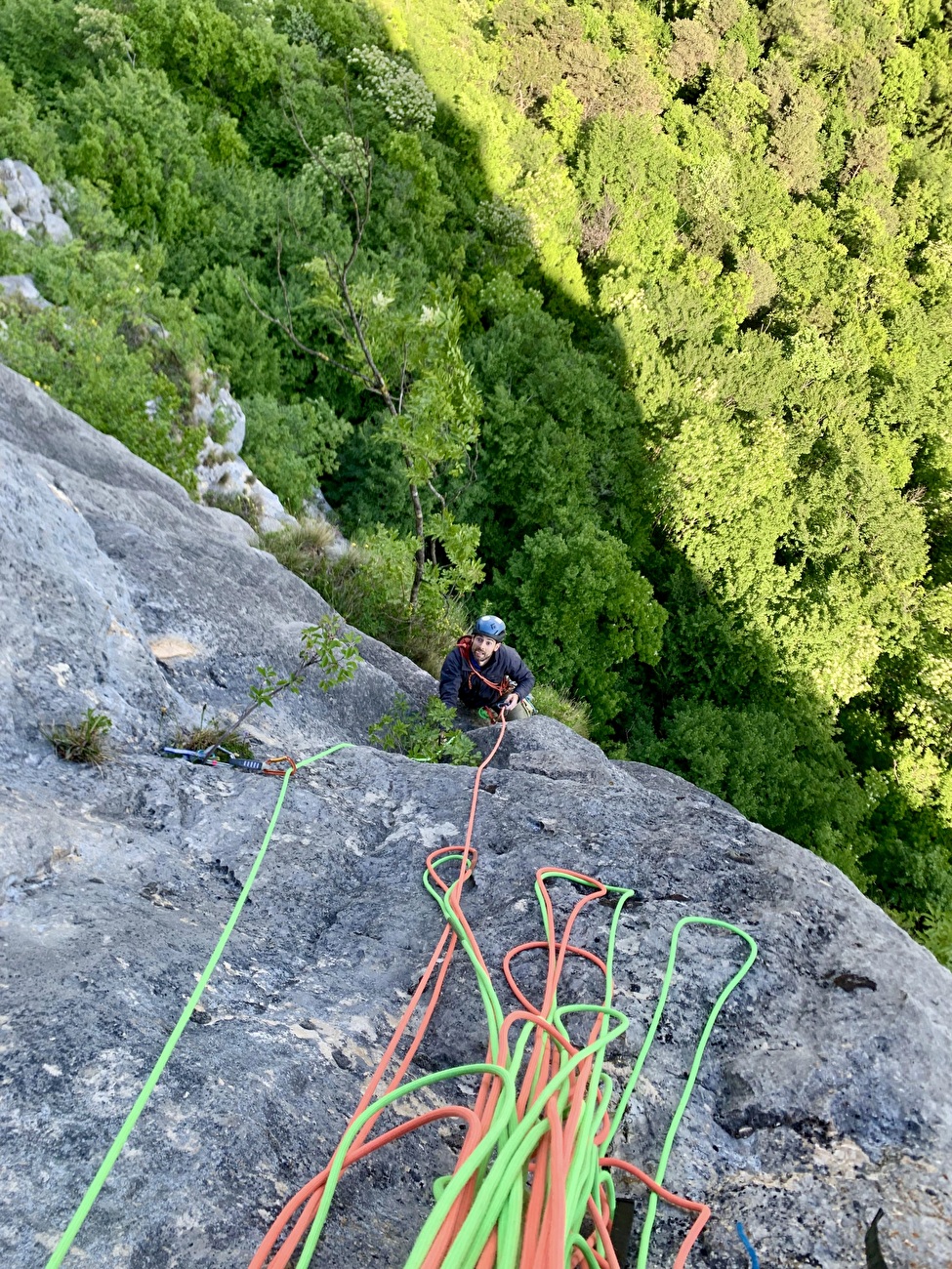 L'apertura del terzo tiro di 'Pipì e Cocò' alla parete del Covelo in Valle del Sarca (Nicola Cont, Filippo Michelon 11-17/05/2025)