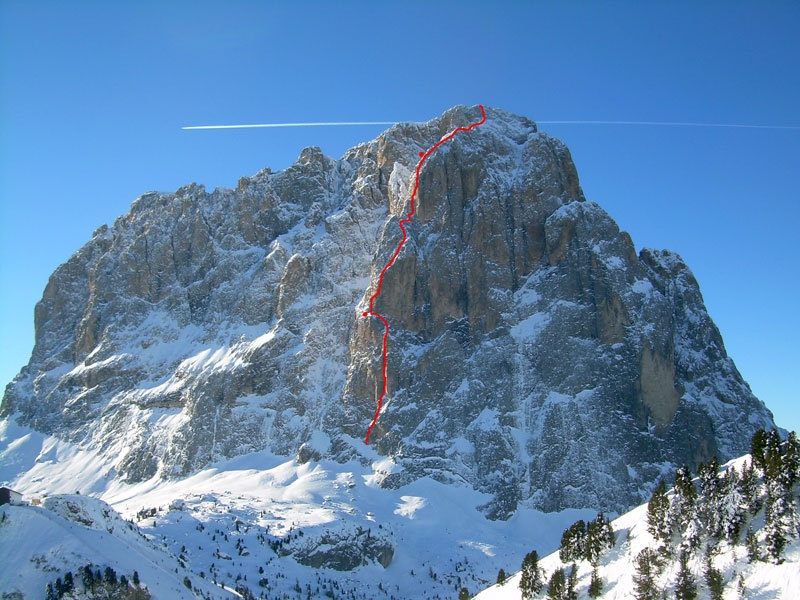Il tracciato del Pilastro Magno con segnati i 2 bivacchi della prtima invernale (la foto è stata scattata due anni prima dell'invernale)