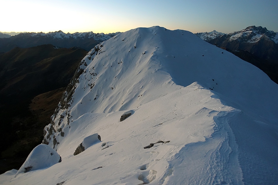 Dalla base dell'ultimo salto uno sguardo all'uscita dello spigolo Castiglioni, durante la prima invernale della via '12 anni di Albani', parete nord della Presolana (Daniele Natali, Maurizio Panseri 29-30/12/2016)