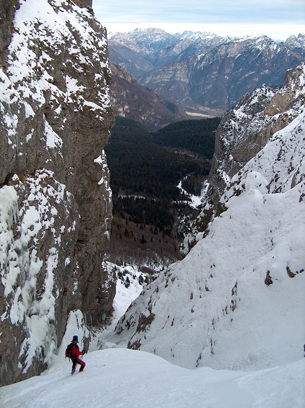 Schiara scialpinismo: gli sci attendono di scendere lungo la Forcella Caneva verso Cajada