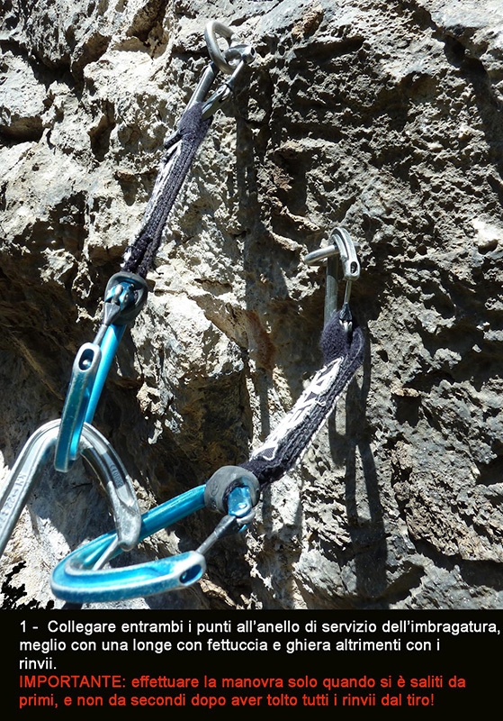 Soste alla francese: collegare entrambi i punti all'anello di servizio dell'imbragatura, meglio con una longe con fettuccia e ghiera, altrimenti con i rinvii. IMPORTANTE: effettuare la manovra solo quando si è saliti da primi, e non da secondi dopo aver tolto tutti i rinvii dal tiro!