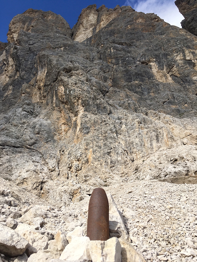 Sparalesto sul Pilastro del Monte La Banca (Gruppo Marmolada, Dolomiti), Susanna De Biasio, Davide Rovisi 09/2021. 'All’attacco abbiamo fatto un ometto con i resti di una bomba inesplosa… dal dopo guerra fino agli anni '90 queste montagne sono state un poligono di tiro naturale per periodiche esercitazioni militari… i ghiaioni sono purtroppo cosparsi da questi residui contrariamente a quelli delle cime vicine (Cima Uomo ecc) che risalgono alla Grande Guerra'