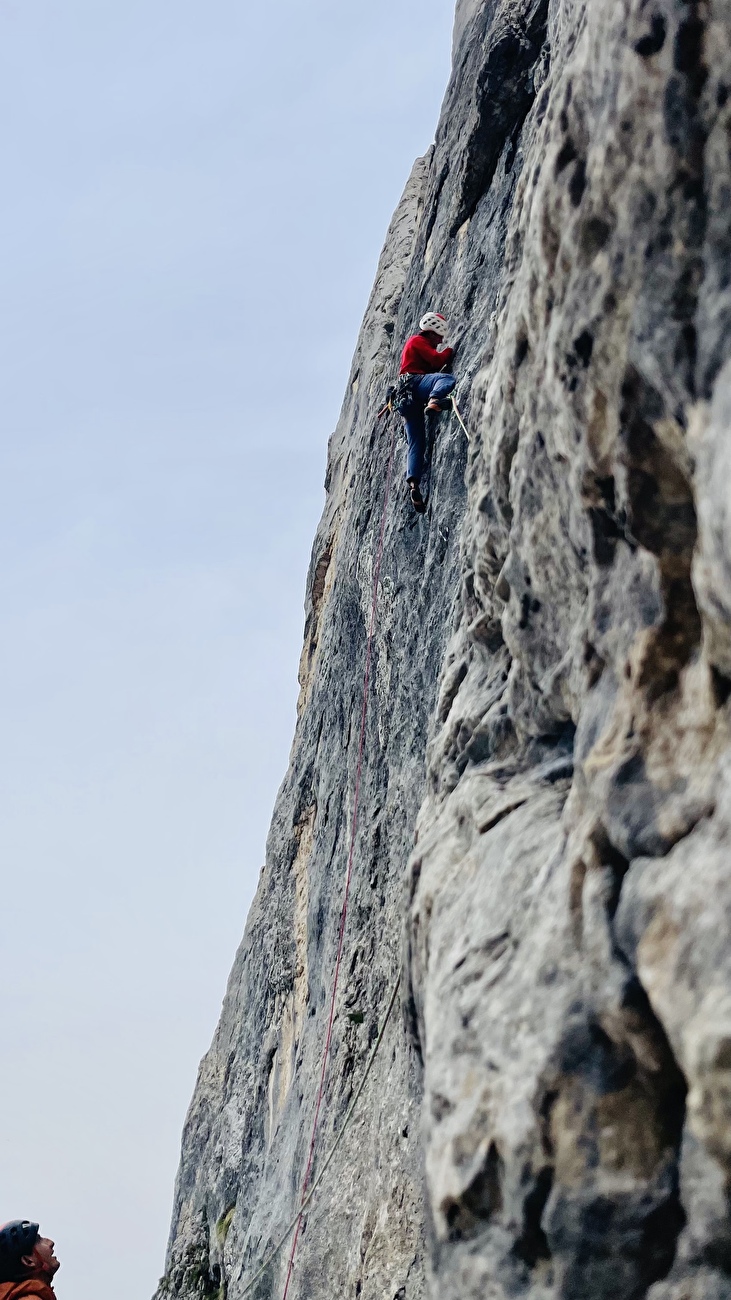 Martin Giovanazzi sul primo tiro di 'SuPer Nava', Sas da la Luna, Dolomiti (Maurizio Davarda, Martin Giovanazzi, Elio Mazzalai, 2024-2025).