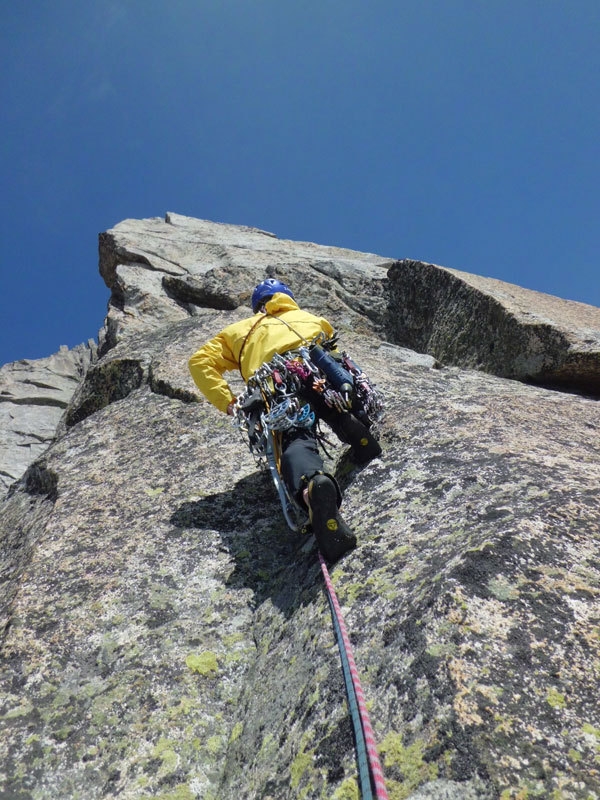 Techno Progressive (260m, VI+, VII+ con un tratto di A1) parete Ovest della Prima Gobba del Monte Folletto, Carè Alto, Adamello)