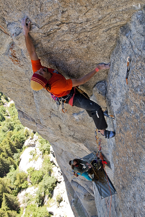 Simone Pedeferri e Daniele Bianchi durante la prima libera di 'Pana' (8b, 265m) sulla Mongolfiera, Alta Val Masino